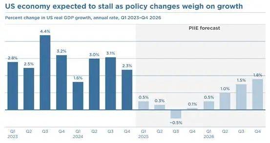 而且,两篇文章接下来还都提到了美国政府的破坏性政策对其自身的损害,尤其是美国的经济增长很可能会在今年迎来停滞皇冠信用网出租代理 。彼得森国际经济研究所就认为美国2025年的GDP增长将从前一年2.5%的年度增长速率,直接跌到0.1%——甚至在今年第三季度还会出现负增长。而美国在未来12个月经济出现衰退的概率,目前已经达到了40%。